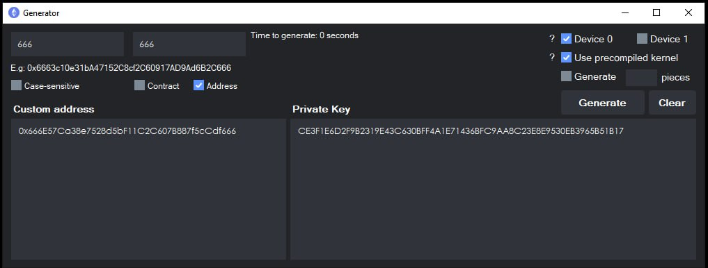 Thanks to our custom build program, we can generate unique wallet addresses or contracts tailored to your specific needs. Choose the prefix, suffix, and case sensitivity to personalize your blockchain identity. Although generating more than 8-9 unique characters can be time-consuming, our software allows us to generate any address or contract meeting the requirements.